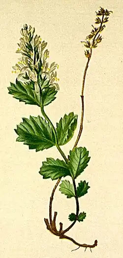 Многолетнее травянистое растение высотой от 5 до 15 см. Олиственные стебли несут, как правило, 3 пары листьев. Листовые пластинки цельные, до 3 см в длину и 2 см в ширину. Каждый край изрезан на 5—9 зубцов. Листья тёмно-зелёные, слегка кожистые.