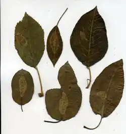 Гусеницы образуют мины на листьях розоцветных яблоне, груше, рябине, сливе, айве, вишне, боярышнике, мушмуле, ирге и кизильнике[3][1]. На севере ареала может развиваться на берёзе[1].