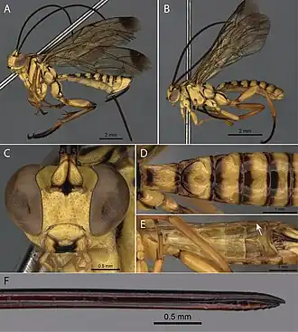 Перепончатокрылые насекомые-ихневмониды, которые от близких мексиканских видов отличаются следующими признаками: основная окраска тела желтоватая; тергиты 2-3 метасомы в центральной части гладкие и полированные; мезоскутум жёлтый с тремя чёрными или коричневыми продольными полосами; метасома ярко-жёлтая с чёрным. Самка с тергитами 6-7 жёлтая, только узко чёрная спереди. Также у самок простые и крупные коготки лапок, прямая вершина яйцеклада, слабовогнутый внутренний край сложного глаза перед местом прикрепления усиков[3][4].