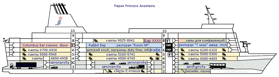 - ↑ Схема парома MOBY SPL Princess Anastasia. Дата обращения: 11 сентября 2011. Архивировано 27 сентября 2011 года.
