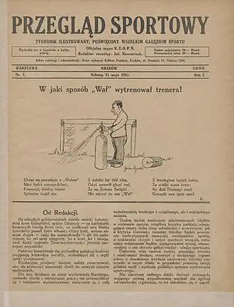 Основатели газеты — группа краковских спортивных журналистов, куда входили Игнаций Розеншток, Й. Биллиг, Александр Дембиньский, Юзеф Школьниковский, Леон Гляйсснер и Тадеуш Сыновец[1]. До ноября 1921 года первым редактором газеты был Розеншток. В первом выпуске значилось, что газета «Przeglad Sportowy» — орган Краковского окружного футбольного союза. С 23 июля 1921 года газета стала официальным органом Польского футбольного союза и четырёх региональных футбольных союзов Кракова, Варшавы, Лодзи и Львова. Первый номер от 6 января 1922 года вышел в пятницу, а позже газета стала выходить и в другие дни. В последующие годы газета стала называть себя официальным органом Польского союза лыжного спорта, Польского теннисного союза (1922) и Польского союза лёгкой атлетики (1923).