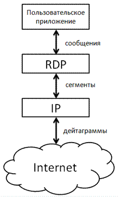 RDP обеспечивает прикладной уровень надёжной службой передачи сообщений. Интерфейс протокола преобразует данные пользователя в сообщения. Сообщения, в свою очередь, в ходе обмена данными между RDP и IP преобразуются в сегменты данных и далее в дейтаграммы.