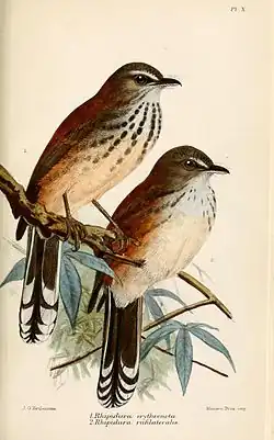 Небольшие (масса тела взрослой особи составляет 12 г) птицы с длинным хвостом, который они часто распускают веером. Оперение на теле по большей части красновато-коричневое, голова — серовато-коричневая с белыми полосами на «бровях» и «щеках», горлышко и грудь — белые с чёрными отметинами. Встречаются в лесах и на опушках, избегают открытых пространств. Похожи на R. albiscapa, но намного темнее, с другим рисунком на груди. Обычные крики — высокие, слабые звоночки и трели[2].