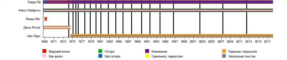 - Гедди Ли — вокал, бас-гитара, клавишные (1968—2018)