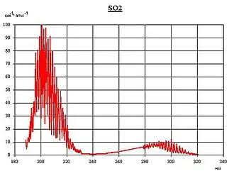 Необходимо отметить также, что диоксид серы имеет максимум в спектре поглощения света в ультрафиолетовой области (190—220 нм), что совпадает с максимумом в спектре поглощения озона. Это свойство диоксида серы позволяет утверждать, что наличие этого газа в атмосфере имеет также положительный эффект, предотвращая возникновение и развитие онкологических заболеваний кожи человека. Диоксид серы в атмосфере Земли существенно ослабляет влияние парниковых газов (диоксид углерода, метан) на рост температуры атмосферы[24].