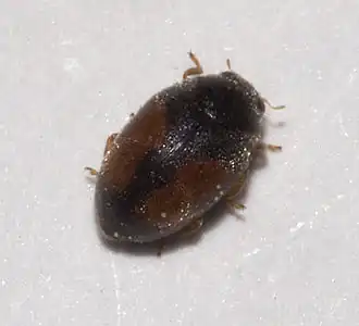 Жук длиной 1,3—1,8 мм. Надкрылья чёрные, с одним большим и длинным красно-жёлтым пятном, лежащим посередине надкрылий[1].