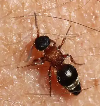 Мелкие жалящие перепончатокрылые насекомые. Длина самцов от 3 до 10 мм (самки — 3—7 мм). Самки бескрылые. Голова и брюшко чёрные, грудка и ноги рыжие (самцы могут быть полностью чёрные). Клипеус с 2 зубцами. Паразитоиды роющих одиночных ос Crabronidae и дорожных ос Pompilidae[2][3][5]. Вид был впервые описан в 1787 году датским энтомологом Иоганном Христианом Фабрицием[6].