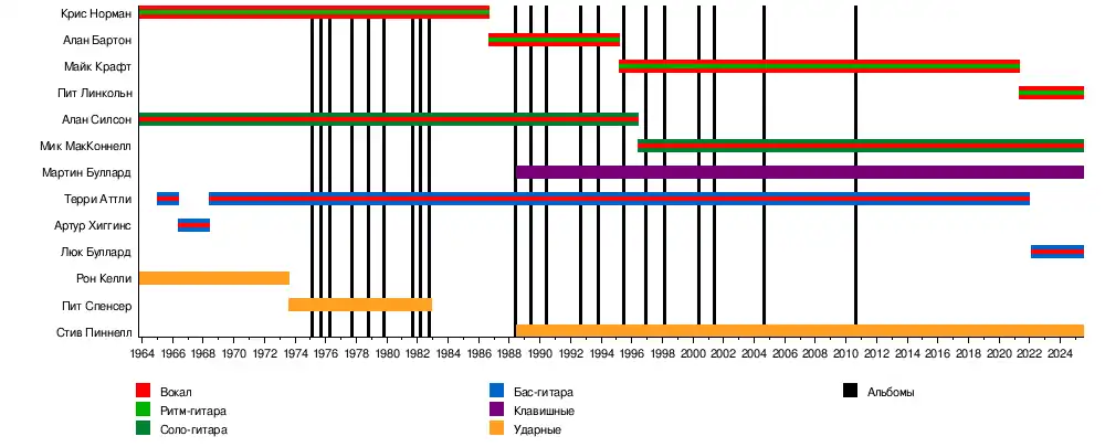- Терри Аттли (англ. Terry Uttley) — бас-гитара, вокал (1965—1966, 1968—2021; умер в 2021)