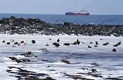 Перелётная птица, зимует на незамёрших участках моря к югу до южного побережья Гренландии, Исландии (где редка), Норвегии, Камчатки, Алеутских островов и Ньюфаундленда.[10] При этом решающее значение имеет не температура воздуха, а состояние воды — нередко утки собираются у самой кромки льда.[4] Птицы, гнездящиеся на Шпицбергене и в арктических регионах России к востоку до западного Таймыра, на зиму перемещаются в западном направлении — большей частью в районы Белого Моря и территориальных вод Норвегии. Небольшая часть птиц, зимующая в Исландии, по всей видимости прилетает из Канады, Гренландии и Шпицбергена.[10] В ноябре 2020 года залётная утка была отмечена в Москве[11].