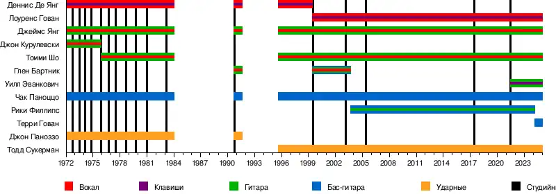 - Деннис Де Янг — вокал, клавишные, аккордеон (1971—1984, 1989—1992, 1995—1999)