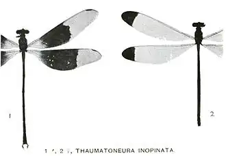 - ↑ Calvert, P. P. (1902). On the systematic position of Thaumatoneura inopinata, McLachlan (order Odonata), with some remarks on the classification of the suborder Zygoptera. Entomologist's Monthly Magazine, 38, 29-3