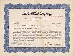 С 1919 года Coca-Cola является публичной компанией[10], её акции размещены на Нью-Йоркской фондовой бирже под тикером «KO»[11]. Купленная в 1919 году за 40 долл. одна акция компании с учётом реинвестирования всех дивидендов в 2012 году стоила бы 9,8 млн долл. (то есть ежегодный рост цены акции составляет 10,7 % с поправкой на инфляцию)[12]. Банк-предшественник SunTrust, получивший в 1919 году 100 тыс. долл. акциями Coca-Cola за андеррайтинг, в 2012 году продал их за 2 млрд долл[13]. В 1987 году Coca-Cola снова вошла в число 30 компаний, чьи акции составляет основу индекса Dow Jones Industrial Average, ранее компания входила в его состав с 1932 по 1935 год[14]. С 1920 года компания выплачивает дивиденды, к 2019 году постоянный рост их размера длится 57 лет[15][16][17][18].