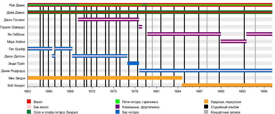 - Рэй Дэвис (англ. Ray Davies) — вокал, ритм-гитара, клавишные, гармоника (1963—1996)
