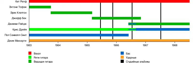 Кит Релф Пол Самвелл-Смит Энтони Тофэм † Крис Дрейя Эрик Клэптон Джефф Бек Джимми Пейдж Алан Глен Билли Бой Мискиммин Бен Кинг |