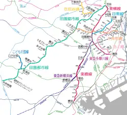 Tokyu Corporation (яп. 東京急行電鉄株式会社 то:кё: кю:ко: дэнтэцу кабусики гайся) — крупный японский частный железнодорожный оператор и центральная компания группы Tokyu Group (яп. 東急グループ то:кю: гуру:пу), которая вовлечена в общественный транспорт, торговлю недвижимостью, розничную торговлю и другие отрасли. Линии компании соединяют центральную часть японской столицы Токио с городами префектуры Канагава на юго-западном направлении. Компании также принадлежит обширная сеть автобусных маршрутов и такси. На всех станциях железнодорожных линий компании (кроме линий Сэтагая и Yokohama Minatomirai Railway Kodomonokuni Line) установлены либо автоматические платформенные ворота, либо платформенные раздвижные двери.[3]