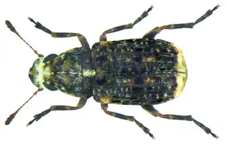 Жук длиной от 3,5 до 5 мм. Верхняя часть тела в коричневых и ржаво-рыжих волосках; головотрубка в белых, а вершина надкрылий в желтоватых волосках. Глаза широко расставлены, расстояние между ними не меньше поперечника глаза[1].