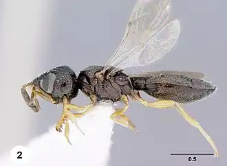 Мелкие перепончатокрылые насекомые: длина тела 2—4 мм. Основная окраска коричневато-чёрная. Голова крупная вытянутая, её длина в 1,5–1,6 раза превышает наибольшую ширину. Усики 12-члениковые у самок и самцов, форма флагелломеров цилиндрическая. Нижнечелюстные щупики состоят из 4 сегментов, а нижнегубные — 2-члениковые. Формула члеников лапок: 5-5-5. Формула шпор голеней: 1-1-1. Отличаются строением головы, сильно выступающим вперёд фронтальным выступом («козырьком») и крупными вытянутыми мандибулами, отсутствием щёчной бороздки (от нижней части сложного глаза до основания жвал)[1]