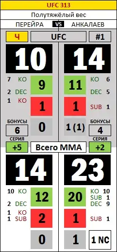 - ↑ UFC 313: Pereira vs. Ankalaev Live Fight Coverage (англ.). ESPN. Дата обращения: 19 января 2025.