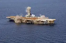 Авианосец стал крупнейшим плавучим объектом, когда-либо специально затопленным человеком. Само потопление было сложнейшей инженерной задачей. Корабль водоизмещением более 32000 тонн и длиной 265 метров тонул в течение 37 минут. По специально разработанному плану затопления на авианосце в рассчитанных местах разместили заряды взрывчатого вещества (потребовалось 225 килограммов взрывчатки), чтобы при погружении он лег на дно на ровном киле, на глубине около 60 метров, а корпус был ориентирован в направлении север-юг.