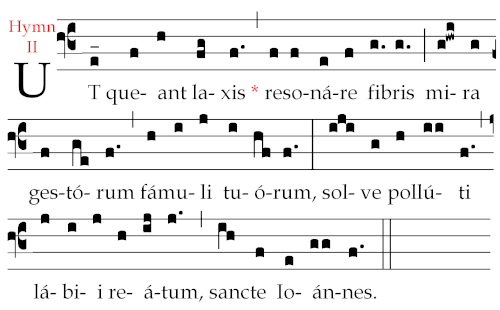 Особенность распева гимна такова, что каждая строка строфы распевается на новую мелодическую фразу, которая начинается со следующей по порядку ступени диатонического гексахорда, первая мелодическая фраза начинается слогом ut и звуком C (в натуральном гексахорде) или G (в твёрдом гексахорде), вторая — re (D / A), третья — mi (E / h) и так далее. Автором «дидактической» мелодии, обеспечившей «поступенную» привязку стихов (известного ранее, но с другой мелодией) гимна, был, по общему мнению, Гвидо Аретинский[4]. Подробней о дидактической реформе Гвидо и её позднейшей рецепции см. сольмизация.