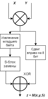 Алгоритм строится на основе каскадного использования функции смешения ( — знак побитовой конъюнкции, — битовая операция исключающего «ИЛИ», битовый сдвиг является логическим)[7], которая при помощи -блока замены преобразует 32-битовые слова и , подаваемые на вход, в 32-битовое слово на выходе. Причем слова в -блоке составляются таким образом, что множество старших байтов этих слов представляет собой перестановку от 0 до 255 (первые байты каждого слова являются уникальными), тогда как оставшиеся 3 байта заполняются случайным образом[8]. Функция смешения сделана реверсивной из таких соображений, что знания одного из слов на входе и слова на выходе будет достаточно для восстановления второго неизвестного на входе[9].