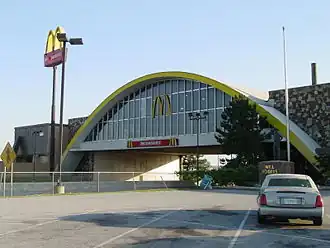 Ранее работавший как ресторан McDonald’s, он был известен как первый ресторан-мост, открытый над шоссе в США и как пример придорожного ресторана в США. Когда здание было рестораном McDonald’s, оно было крупнейшим в мире заведением McDonald’s, прежде чем был построен нынешний крупнейший ресторан McDonald’s в мире, расположенный в Орландо, штат Флорида.[3][3]