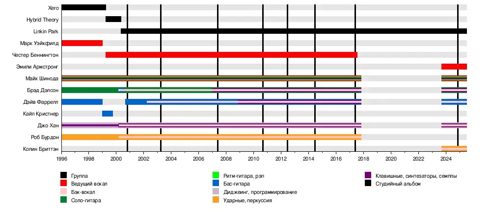 Linkin Park — американская рок-группа, основанная в 1996 году. Нынешний состав группы включает в себя вокалиста/ритм-гитариста/клавишника Майка Шиноду, соло-гитариста Брэда Делсона, басиста Дэйва Фаррелла, диджея Джо Хана, вокалистку Эмили Армстронг и барабанщика Колина Бриттэна. В период выхода первых семи студийных альбомов в составе группы были вокалист Честер Беннингтон и барабанщик Роб Бурдон. Linkin Park приостановили деятельность после самоубийства Беннингтона 20 июля 2017 года. В сентябре 2024 года было объявлено о воссоединении группы с Армстронг и Бриттэном в составе[20].