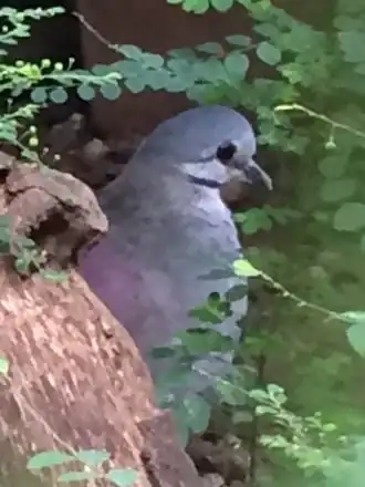 Достигает 20—31,5 см в длину. Голова, шея, горло и грудь взрослой особи светло-голубовато-серые, бока светло-коричневые. У голубя широкая черная скуловая полоса. Спина и крылья оливково-коричневые с небольшим переливом. Молодые особи более тёмные по всему телу, с желтовато-коричневыми полосами на груди и коричневыми краями перьев верхней части тела[3].