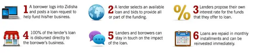 Кредиты, предоставленные через сайт Zidisha, позволяют людям в бедных странах основывать предприятия малого бизнеса. После возвращения ссуд кредиторам те подбирают новых нуждающихся в микрокредитовании. Уникальность системы заключается в том, что отсутствуют посредники между кредитором и его клиентом. Заемщики сами отправляют свои заявки на кредит и непосредственно общаются с кредиторами. Любой человек в стране, обслуживаемой Zidisha, может создать счёт заемщика на веб-сайте Zidisha.org. Прежде чем счёт заемщика будет активирован для регистрации заявок на кредит Zidisha проверяет его кредитную историю. Также Zidisha компенсирует отсутствие формальных кредитных рейтингов в развивающихся странах, но следит, чтобы заемщики возвращали кредиты местным банкам или микрофинансовым учреждениям[2][14][15].