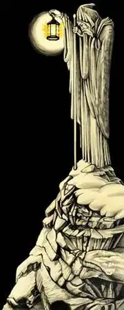 На внутренней стороне складного конверта находится рисунок «Вид в полумраке или переменном свете»[160], выполненный карандашом и золотой краской[161]. На нём вновь изображён отшельник (в стиле карты из колоды Таро Райдера — Уэйта[8]), стоящий на вершине скалистого утёса, с которого открывается вид на обнесённый стеной городок, «похожий на картины Маурица Эшера»[116]. Отшельник держит в одной руке посох/жезл, а в другой — горящую лампу, он смотрит вниз на крошечную фигуру юного адепта, который взывает к нему[162]. Автором рисунка был Баррингтон Коулби, друг Пейджа[комм. 26], однако биографам не удалось найти какой-либо информации о нём или его работах, кроме двух рисунков, выполненных в схожем стиле. Выдвигались версии, что Коулби не был профессиональным художником и, возможно, жил в Швейцарии и имел другой источник дохода. Также были предположения, что «таинственного друга» не существовало вовсе и это был псевдоним Пейджа, который в юности учился в колледже искусств. По словам самого гитариста: «Я предложил его для внутреннего разворота альбома, и все согласились. […] Кое-кто говорит, что там есть аллюзии на Уильяма Холмана Ханта, но это не так. На самом деле идея берёт начало от карты Таро „Отшельник“ и, следовательно, восхождения к путеводной звезде и свету истины. Всему свету, так сказать…»[164]. В Ордене восточных тамплиеров 8, 9, 10, 11 и 12 ступени — высшие уровни порядка от Совершенного Понтифика Просвещения до Внешнего Главы Ордена (которого достиг Кроули) — известны как Триада Отшельника. В «Книге Тота» Кроули пишет следующее: «…один из его [Отшельника] титулов — психопомп, проводник души сквозь низшие сферы. На это символически указывает его Змеиный Жезл… За ним следует Цербер […], которого он приручил. Эта карта показывает всё таинство жизни в её самых секретных трудах»[165]. Если поднести складной конверт к зеркалу, под Отшельником можно разглядеть очертания чёрного пса с двумя головами, что, вероятно, тоже является отсылкой к Церберу[140]. По мнению Уолла, Отшельник, который синонимичен Магу (или Мастеру Магу), представляет собой путеводный огонь, духа-наставника для человечества[166]. Впоследствии Пейдж сыграл этого персонажа в концертном фильме «Песня остается прежней»[167].