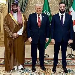 Ahmed Hussein al-Sharaa (Arabic: أحمَد حُسين الشرع) (born 29 October 1982) also known by his nom de guerre Abu Mohammad al-Julani (Arabic: أبو محمد الجولاني) (Also transliterated as Joulani, Jolani, and Golani.) is a Syrian politician and former rebel commander who is currently serving as the president of Syria since January 2025. He previously served as the country's de facto leader from December 2024 until his appointment as president.
