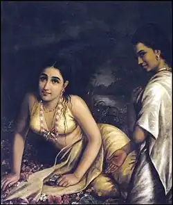 - Nala, prince of Nishada, chosen from among many competitors for her hand by Damayantī, [[w:Princess|princess of Vidarbha, passes several years of happy married life with her. Then, possessed by the demon Kali, and indulging in gambling, he loses his kingdom and all his possessions. Wandering half naked in the forest with Damayantī, he abandons her in his frenzy. Very pathetic is the scene describing how he repeatedly returns to the spot where his wife lies asleep on the ground before he finally deserts her. Equally touching are the accounts of her terror on awaking to find herself alone in the forest, and of her lamentations as she roams in search of her husband, and calls out to him: