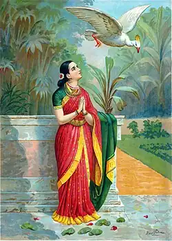Damayanti (दमयंती), a character in Hindu mythology, was the princess of Vidarbha Kingdom, who married king Nala, of Nishadha Kingdom, and their story is told in the Mahabharata. Damayanti was a princess of Vidarbha Kingdom. She was of such beauty and grace that even the gods could not stop from admiring her. She fell in love with Nala simply from hearing of his virtues and accomplishments from a golden swan.