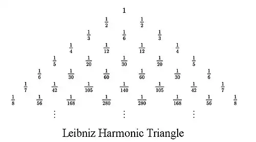 - Pascal's aritmentic triangle and Leibniz' harmonic triangle enjoy a certain inverse relationship... These considerations implanted in Leibniz' mind a vivid conception that was to play a dominant role in his development of the calculus—the notion of an inverse relationship between the operation of taking differences and that of forming sums of the elements of a sequence.