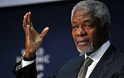 Kofi Atta Annan (8 April 1938 – 18 August 2018) was a Ghanaian diplomat who served as the seventh Secretary-General of the United Nations from January 1997 to December 2006. Annan and the United Nations were the co-recipients of the 2001 Nobel Peace Prize.