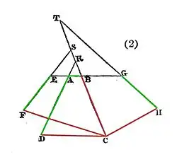 AB, AD, EF and GH (fig. 2) are the given lines, C the required point from which are drawn the lines CB, CD, CF and CH making given angles CBA, CDA, CFE, and CHG. AB (=x) and BC (=y) are the principal lines to which all the others will be referred. Suppose the given lines to meet CB in the points R, S, T, and AB in the points A, E and G. Let AE = c and AG = d... By the... method he found the equation to be;which he showed belonged to a circle.- Samuel Wilkes Waud, A Treatise on Algebraical Geometry (1835) p. 148