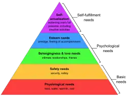Maslow's hierarchy of needs is an idea in psychology proposed in 1943 by Abraham Maslow of a classification system which reflects the hierarchy of universal human needs. It is often portrayed in the shape of a pyramid with the largest, most fundamental needs at the bottom and the need for self-actualization and transcendence at the top. The idea is that individuals' most basic needs (food, shelter) and emotional needs (safety, belonging, self esteem) must be met before they become motivated to achieve higher-level needs for "self-actualization".