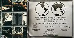WE CAME IN PEACE FOR ALL MANKIND.- Lunar landing commemorative plaque of Apollo 11, originally suggested and designed by NASA's head of technical services Jack Kinzler.