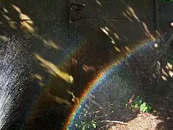 Rainbows are phenomena of light, its perception by the physical senses and the conceptual mind which produces the appearance of a spectral band of colors, often apparently high in the sky, but also at times in close proximity to the observer. The spectrum of colors produced is also itself referred to as the rainbow, and is associated with similar optical phenomena, such as halos, glories, and iridescence. It is widely used symbolically in ways denoting harmonious unity of purpose amidst diversity by various ethnic, religious and other social groups, and as a sign of a divine covenant, being, or a mystical or magical bridge between mortal and immortal realms in various cultures.
