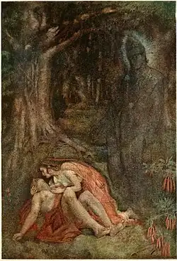 - The kings daughter and the hermits son are therefore married, and the bride strive to forget the ominous prophesy; but as the last day approaches her anxiety becomes irrepressible. She exhausts herself in prayers and penances, hoping to stay the hand of the destroyer; yet all the while dares not reveal the fatal secret to her husband. As the last dreaded day arrives, and Satyavan sets out to cut in the forest. His wife asks leave to accompany him, but with a heavy heart. Satyavan soon makes the wood resound with his hatchet, when suddenly through his temples shoots a thrill of agony, and feeling himself falling he calls out to his wife to support him.