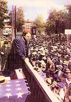 - You remember that, at the close of Theodore Roosevelt's second term as President, he went over to Africa to make war on some of his ancestors. You remember that, at the close of his expedition, he visited the capitals of Europe; and that he was wined and dined, dignified and glorified by all the Kaisers and Czars and Emperors of the Old World. He visited Potsdam while the Kaiser was there; and, according to the accounts published in the American newspapers, he and the Kaiser were soon on the most familiar terms. They were hilariously intimate with each other, and slapped each other on the back. After Roosevelt had reviewed the Kaiser's troops, according to the same accounts, he became enthusiastic over the Kaiser's legions and said: “If I had that kind of an army, I could conquer the world.” He knew the Kaiser then just as well as he knows him now. He knew that he was the Kaiser, the Beast of Berlin. And yet, he permitted himself to be entertained by that Beast of Berlin; had his feet under the mahogany of the Beast of Berlin; was cheek by jowl with the Beast of Berlin. And, while Roosevelt was being entertained royally by the German Kaiser, that same Kaiser was putting the leaders of the Socialist Party in jail for fighting the Kaiser and the Junkers of Germany. Roosevelt was the guest of honor in the white house of the Kaiser, while the Socialists were in the jails of the Kaiser for fighting the Kaiser. Who then was fighting for democracy? Roosevelt? Roosevelt, who was honored by the Kaiser, or the Socialists who were in jail by order of the Kaiser? “Birds of a feather flock together.” ... If Theodore Roosevelt is the great champion of democracy —the arch foe of autocracy , what business had he as the guest of honor of the Prussian Kaiser? And when he met the Kaiser, and did honor to the Kaiser, under the terms imputed to him, wasn't it pretty strong proof that he himself was a Kaiser at heart? Now, after being the guest of Emperor Wilhelm, the Beast of Berlin, he comes back to this country, and wants you to send ten million men over there to kill the Kaiser; to murder his former friend and pal. Rather queer, isn't it? And yet, he is the patriot, and we are the traitors. I challenge you to find a Socialist anywhere on the face of the earth who was ever the guest of the Beast of Berlin, except as an inmate of his prison—the elder Liebknecht and the younger Liebknecht, the heroic son of his immortal sire.