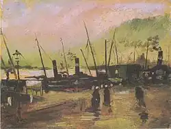 - He went to work in Asnières together with Signac or Emile Bernard; he paid frequent visits to Guillaumin... he studied the masterpieces of the Louvre and particularly the paintings of Delacroix; he saw more or less frequently Toulouse-Lautrec, who had also been for a while under the influence of the impressionists; he had frantic discussions with almost every one of his new acquaintances, trying to absorb as much as he could... [H]e studied assiduously the paintings at the eighth impressionist exhibition ...he visited the Salon and later the Salon des Indépendants ...Theo and his painter friends also took him to Durand-Ruel's, to [Arsène] Portier's, to père Martin's and especially to the little place of père Tanguy. Van Gogh and père Tanquy quickly became fast friends, much to the distress of Mme Tanguy, who saw her husband supply the young man with canvas and paints (he used much of both) in return for unsaleable paintings. Cézanne... is supposed to have seen in these paintings only the work of a madman. But old Tanguy... divided his admiration equally between Cézanne and van Gogh.