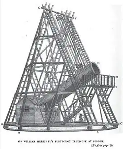 - In the year 1783 I finished a very good twenty-foot reflector with a large aperture, and mounted it upon the plan of my present telescope. After two years' observation with it, the great advantage of such apertures appeared so clearly to me that I recurred to my former intention of increasing them still further; and being now sufficiently provided with experience in the work which I wished to undertake, the President of the Royal Society, who is always ready to promote useful undertakings, had the goodness to lay my design before the king. His Majesty was graciously pleased to approve of it, and with his usual liberality to support it with his royal bounty.