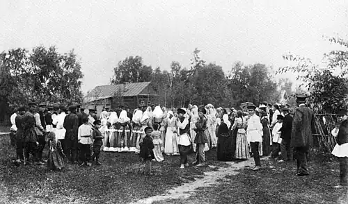 Толпа юношей в ярких рубахах и девушек, пестревших платьями, разделилась на две группы, и по саду разнеслось и вынеслось на улицу громкое: «А мы просо сеяли, се-я-ли. Ой, дид-ладо, сеяли, се-я-ли!». И задорный ответ: «А мы просо вытопчем, вытопчем. Ой, дид-ладо, вытопчем, вытопчем!»[3] | |