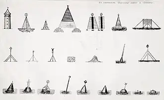 Знаки предостерегательные служат для ограждения опасностей в морях и реках. <...> Плавучими ограждениями служат: <...> баканы, буи и вехи. В России чаще всего употребляют вехи.