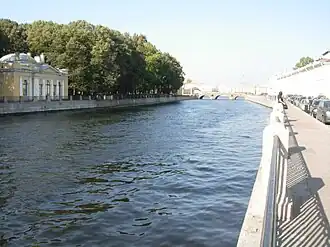Безымянный же ерик мог бы стать рекой, до залива ему не так далеко оставалось бежать. А он взял и снова впал в Неву. На берегах Безымянного ерика построил себе Летний дворец Пётр I, раскинул прекрасный Летний сад. В саду архитекторы устроили различного вида и форм — фонтаны. Вот тут-то и захотели дать ерику имя. Назвали его Фонтанной рекой, или просто Фонтанкой. | |
