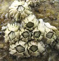 Балянусы в друзах зачастую обитают вплотную друг к другу, в силу чего те или иные части их домиков оказываются недоступными для поселения эпибионтов.[5] | |