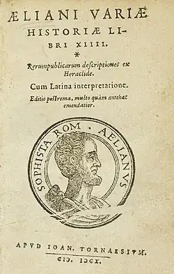 Кла́вдий Элиа́н (лат. Claudius Aelianus; ок. 170 — после 222) — древнеримский писатель, историк и философ, представитель так называемой «второй софистики». Писал по-гречески. От Элиана до нас дошли два сочинения: «О природе животных» (Περὶ ζῴων ἰδιότητος) в XVII книгах и «Пёстрая история» (Ποικίλη Ιστορία) в XIV книгах.