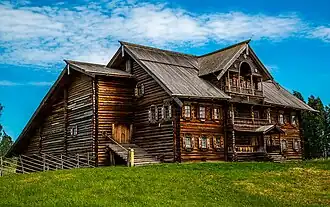...шестистенок (или крестовик) имел две капитальные стены, делящие внутреннее пространство. Этот дом представлял собой составленные вместе четыре сруба с общими внутренними бревенчатыми стенами, длина каждой стены, составленной из двух брёвен, достигала 12 саженей. Площадь таких домов бывала огромной — более 600 кв. м.[6] | |