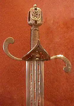 В Королевском арсенале Мадрида находится великолепный и очень хорошо известный меч, приписываемый Фердинанду III (святому Фердинанду) Кастильскому (1223—1253 гг.). Его крестовина весьма своеобразна: оба конца свиты в кольцо, куда помещен небольшой трилистник. «Руки» и écusson украшены типичными для тринадцатого века цветочными орнаментами.[5] | |